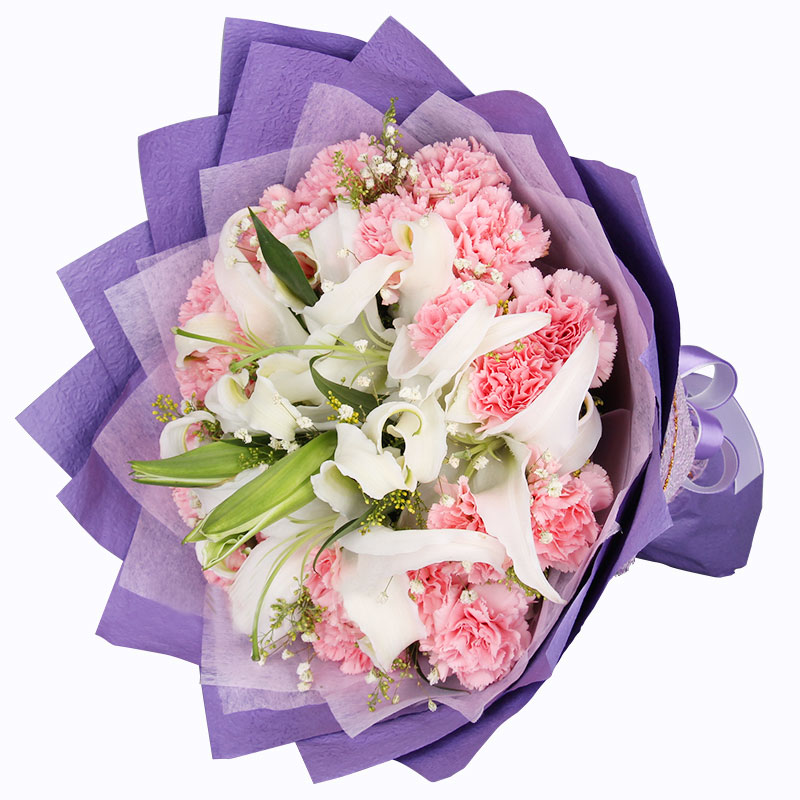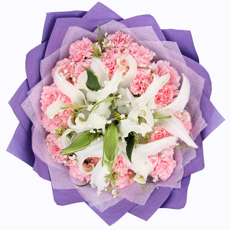 花材: 19朵粉色康乃馨,6朵香水白百合,搭配满天星、黄莺穿插点缀。
