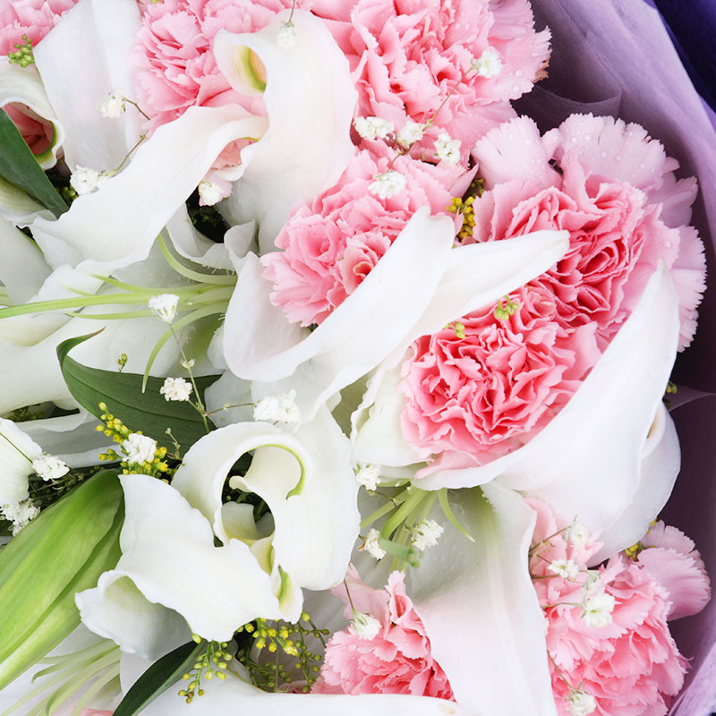 花 材:19朵粉色康乃馨,6朵香水白百合,搭配满天星、黄莺穿插点缀。