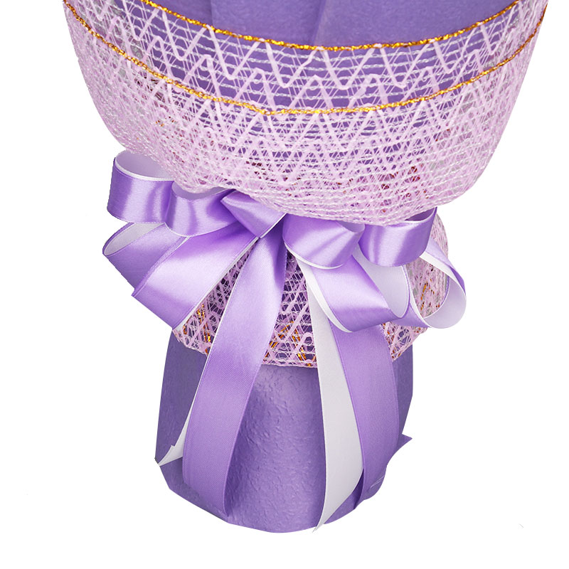 包装: 里层粉色棉纸,外层紫色手揉纸圆形包装,W网托底,紫色花结。