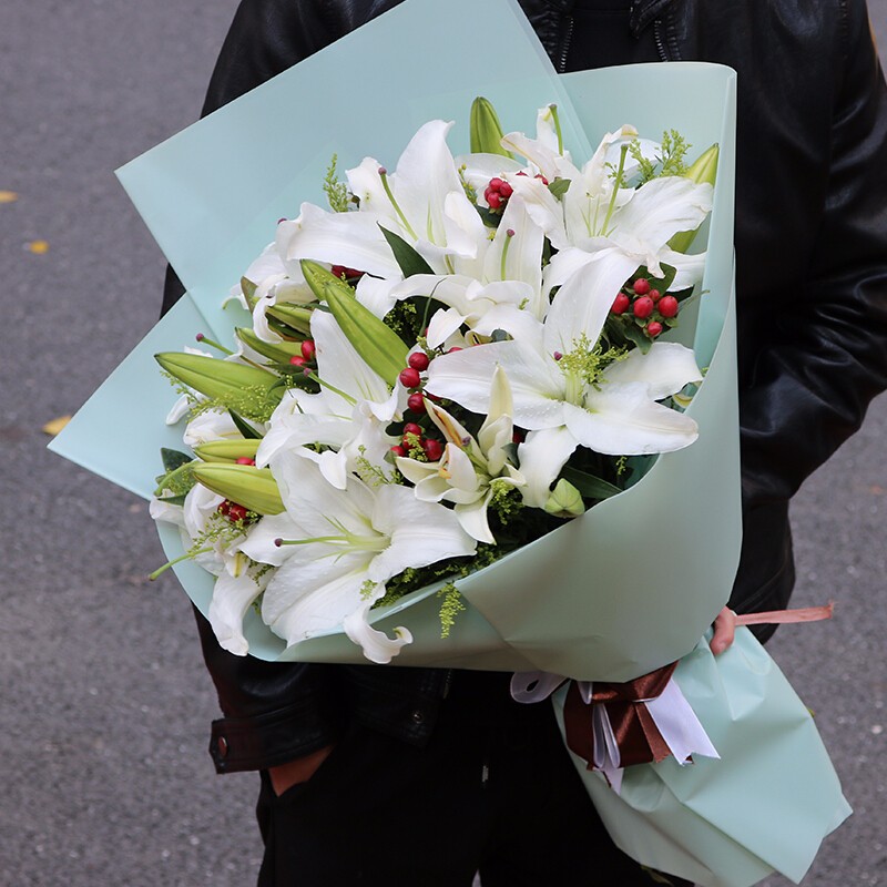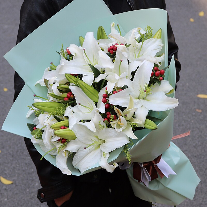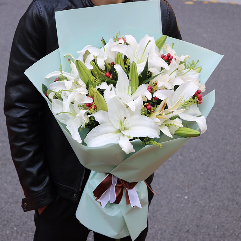 花 材:18朵白色香水百合,搭配红豆、绿叶、黄莺装饰。