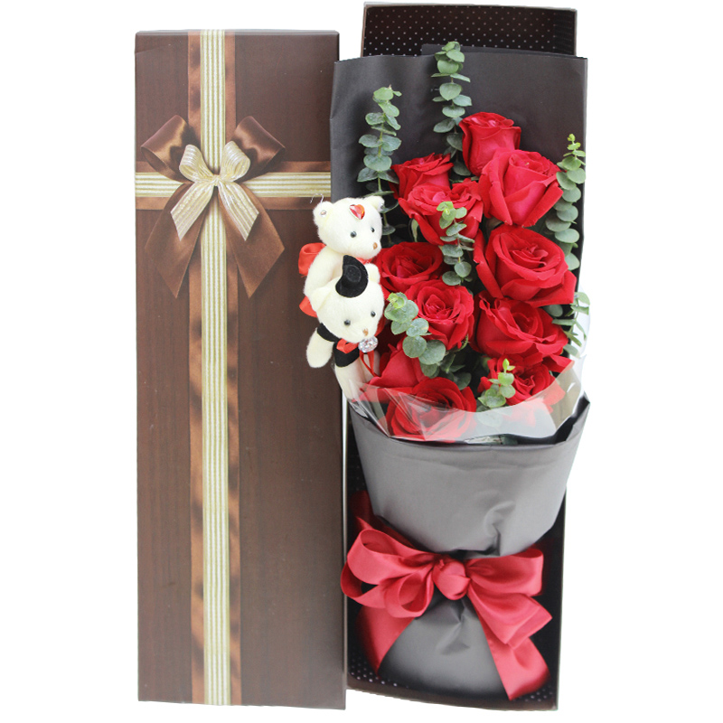 花 材:11朵红玫瑰,一对小熊,搭配尤加利叶。