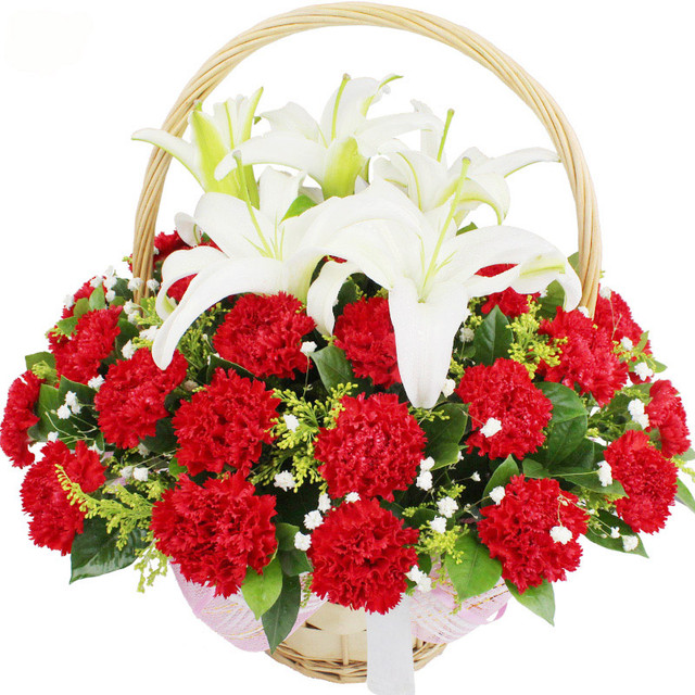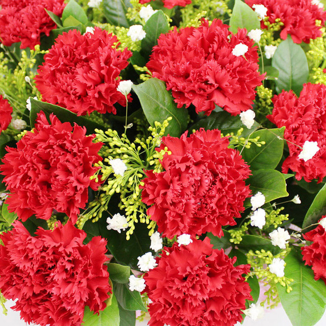花 材:36枝红色康乃馨,2枝香水百合,栀子叶、满天星、黄莺。