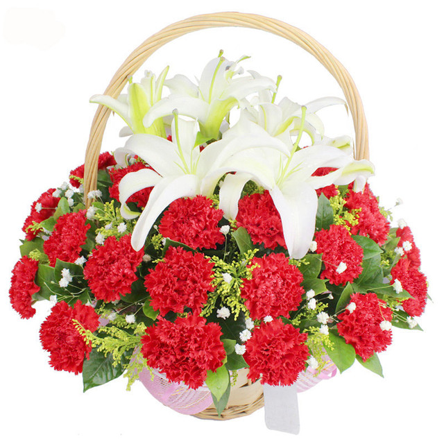 花材: 36枝红色康乃馨,2枝香水百合,栀子叶、满天星、黄莺。