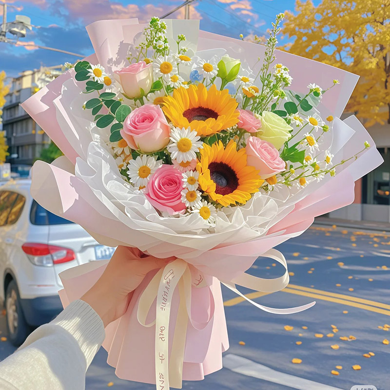 花材: 精选2支向日葵,5支戴安娜粉玫瑰,1支洋桔梗,搭配洋甘菊、尤加利叶装饰。