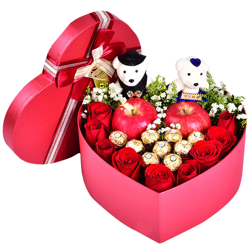 花 材:9朵红玫瑰、9颗费列罗巧克力、2颗红苹果、2只可爱小熊,搭配适量白色满天星、黄莺草装饰。