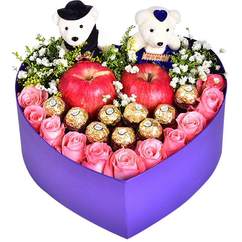 花 材:11朵戴安娜粉玫瑰、9颗费列罗巧克力、2颗红苹果,搭配适量2只可爱小熊、白色满天星、黄莺草装饰。