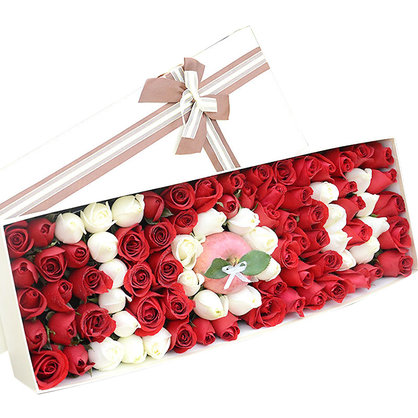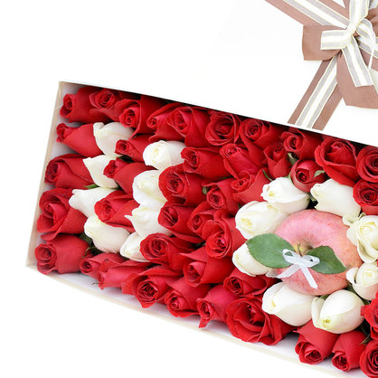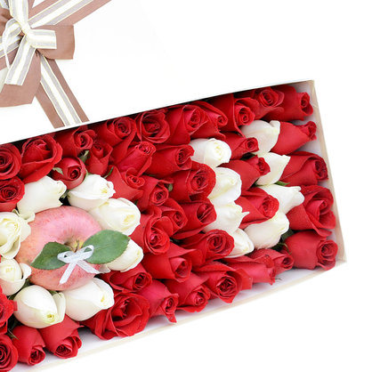 花材: 75朵混色玫瑰(白玫瑰、红玫瑰拼字IOU)、1颗红苹果。
