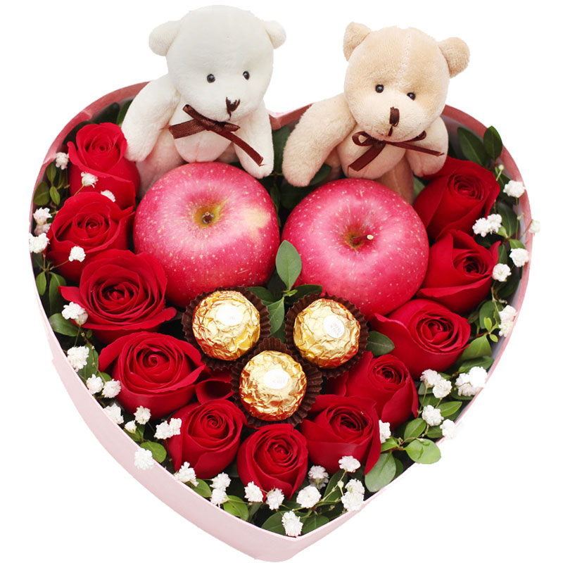 花材: 11朵红玫瑰、3颗费列罗巧克力、2颗苹果、2只可爱小熊,搭配适量白色满天星、绿叶。