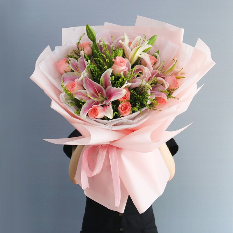 花材: 11枝粉玫瑰,3枝粉色多头香水百合,间插黄莺、栀子叶点缀。