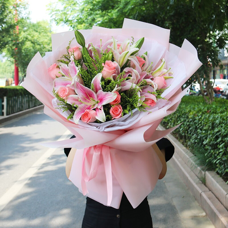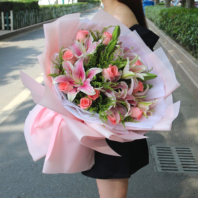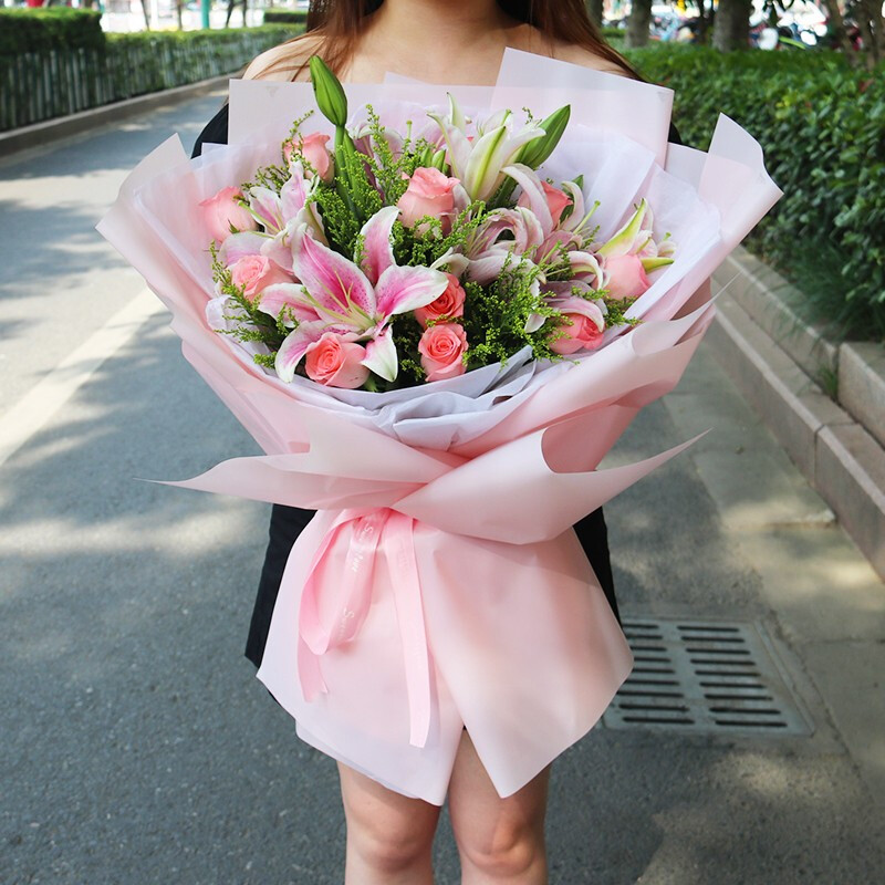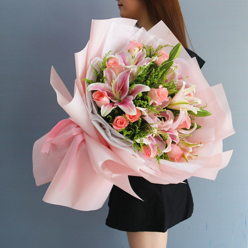 花 材:11枝粉玫瑰,3枝粉色多头香水百合,间插黄莺、栀子叶点缀。