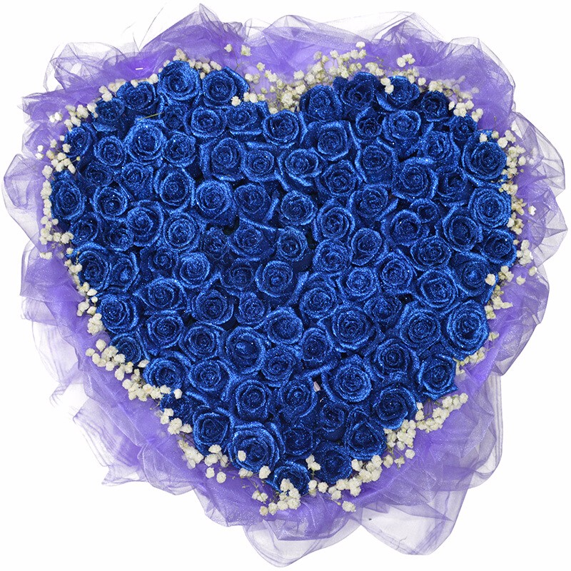 花材: 99朵顶级蓝色妖姬心形包扎,搭配满天星外围环绕。