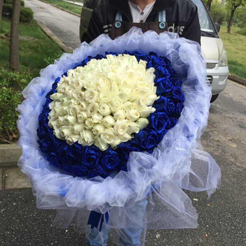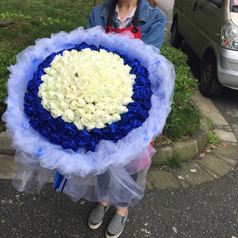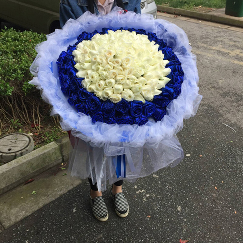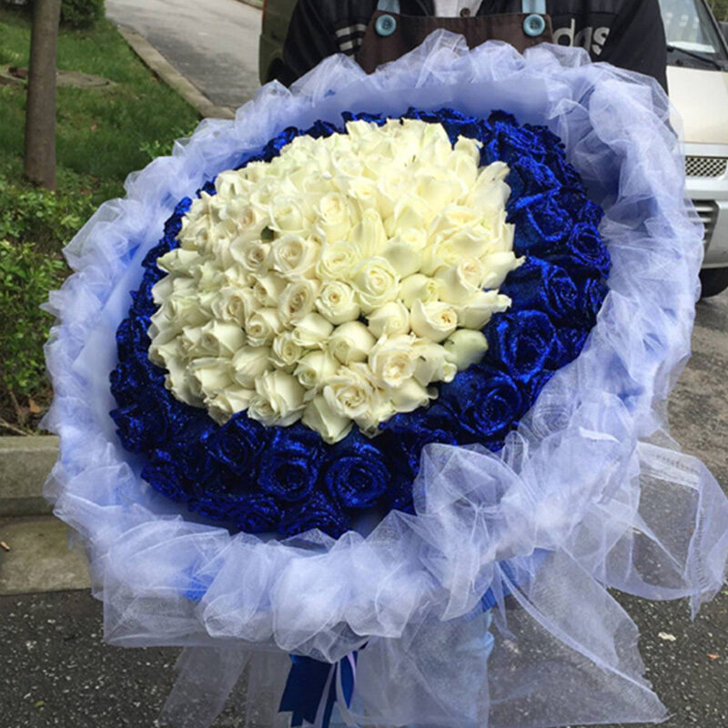 花材: 99朵混色玫瑰(66朵白色,33朵蓝色外围环绕)。