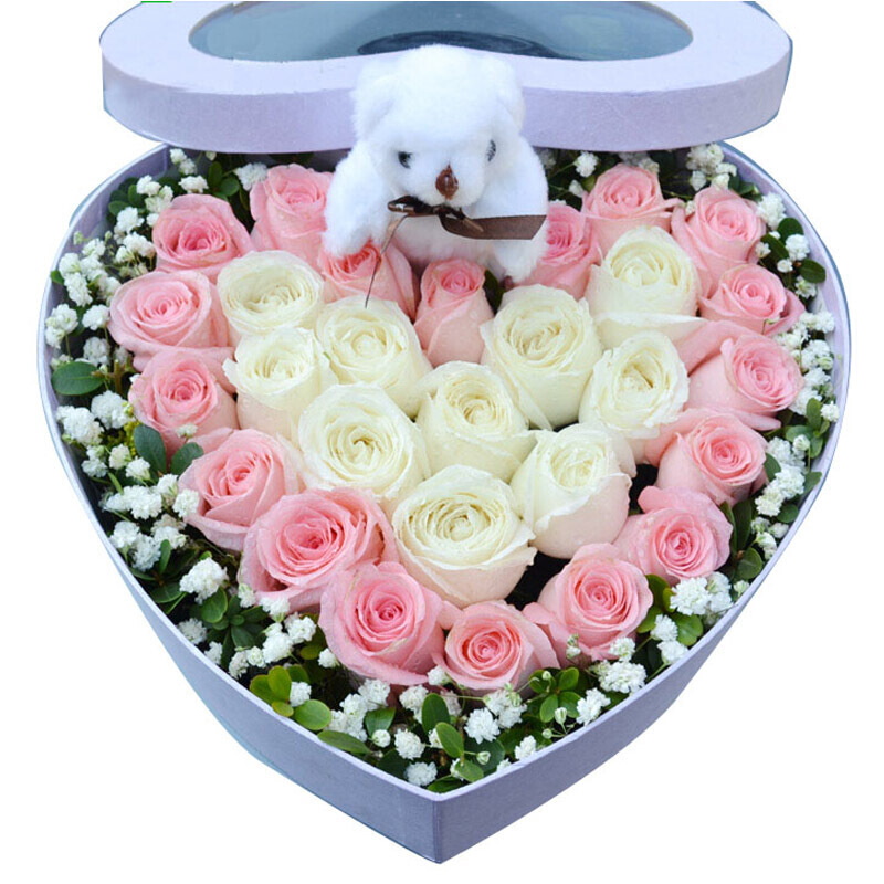 花 材:29支混色玫瑰(10支白色玫瑰,19支粉玫瑰围成心形),一只小熊,外围满天星、绿叶点缀。