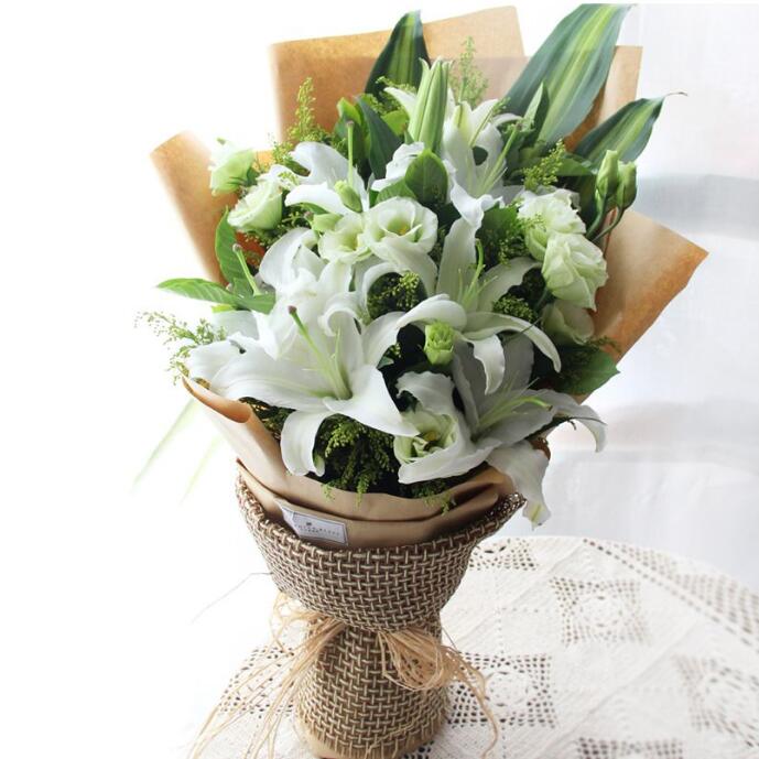 花 材:4支白色多头百合,4支洋桔梗、黄莺、栀子叶搭配。