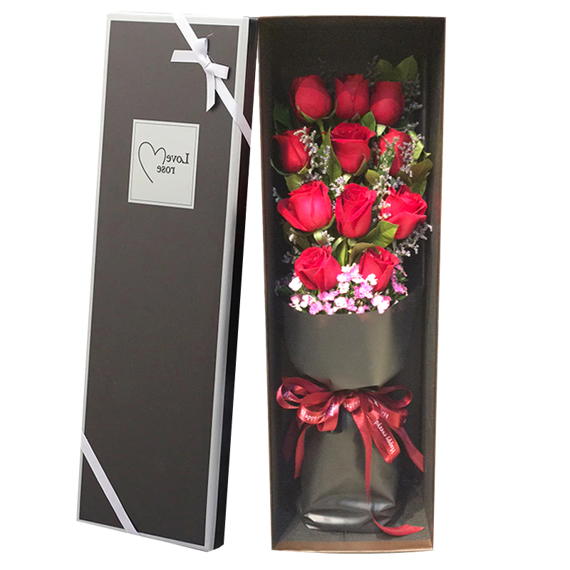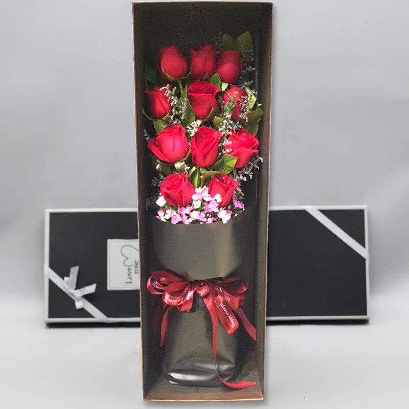 花材: 11朵精品红玫瑰,搭配情人草,黄莺,相思梅点缀。