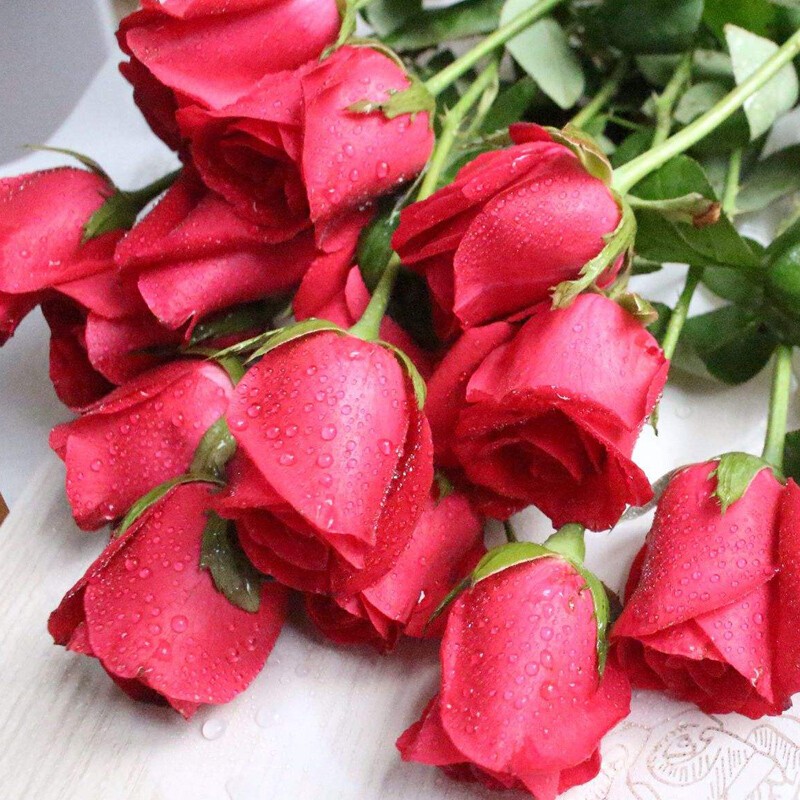 花 材:11朵精品红玫瑰,搭配情人草,黄莺,相思梅点缀。