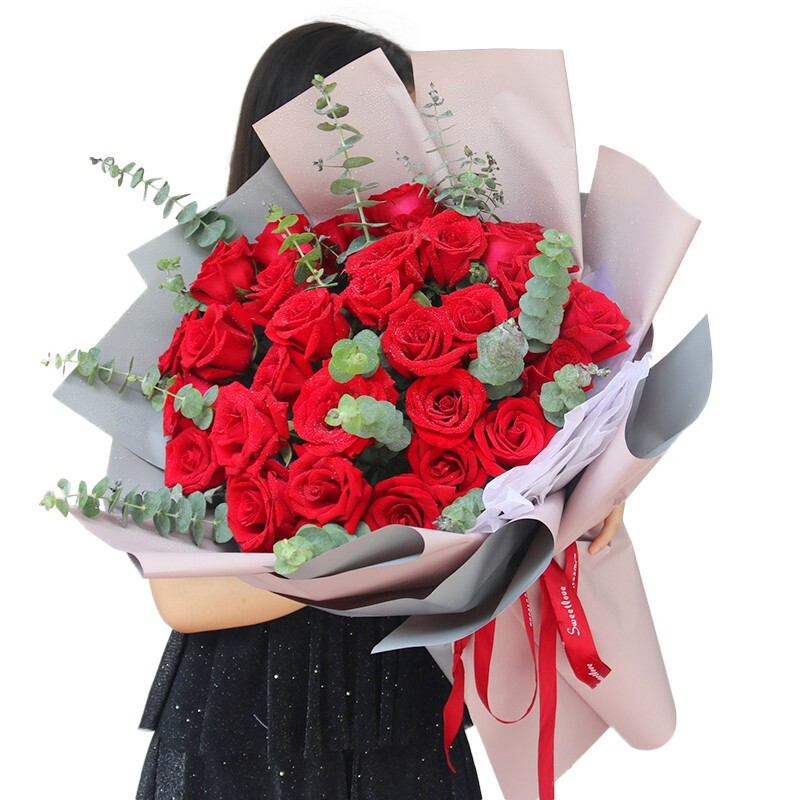 花 材:精选33枝红玫瑰,搭配尤加利叶。