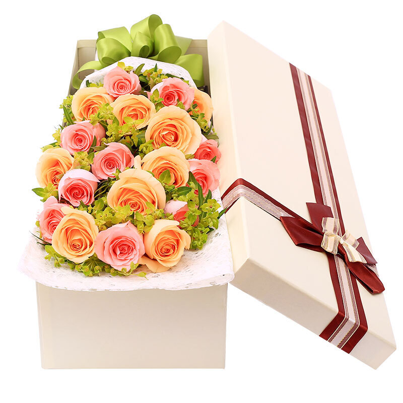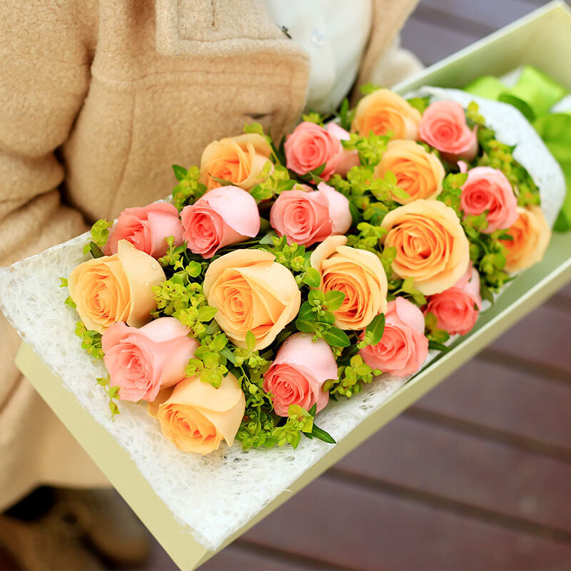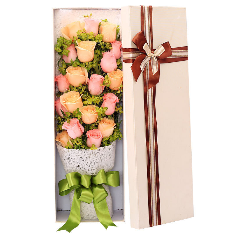 花材: 19朵精品玫瑰(粉色玫瑰10支,香槟色玫瑰9支),搭配叶上黄金。