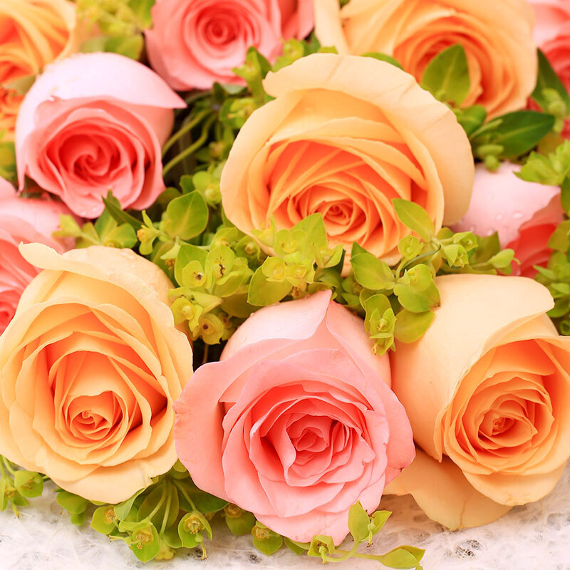 花 材:19朵精品玫瑰(粉色玫瑰10支,香槟色玫瑰9支),搭配叶上黄金。
