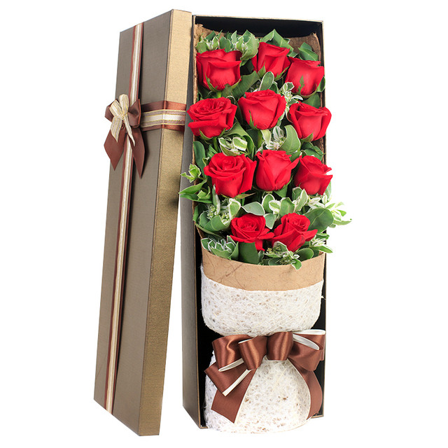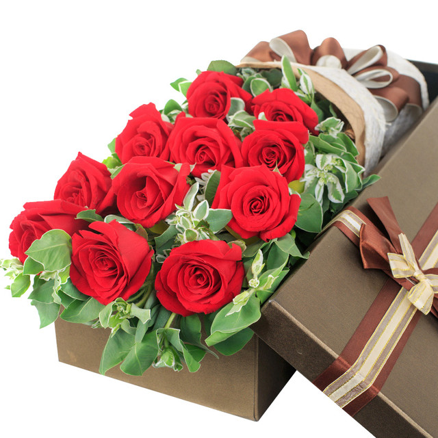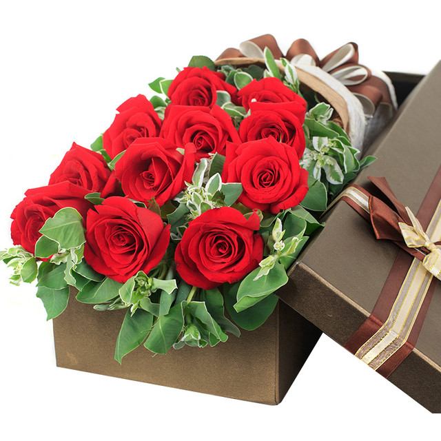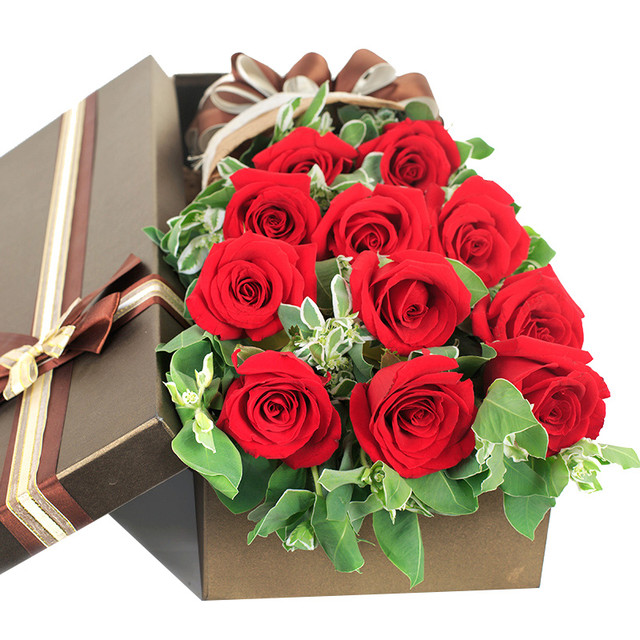 花材: 11朵红玫瑰,搭配高山积雪装饰。