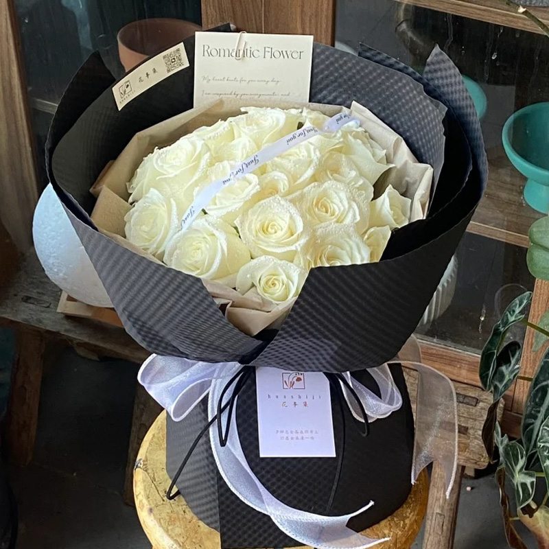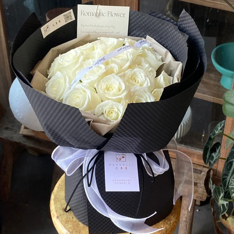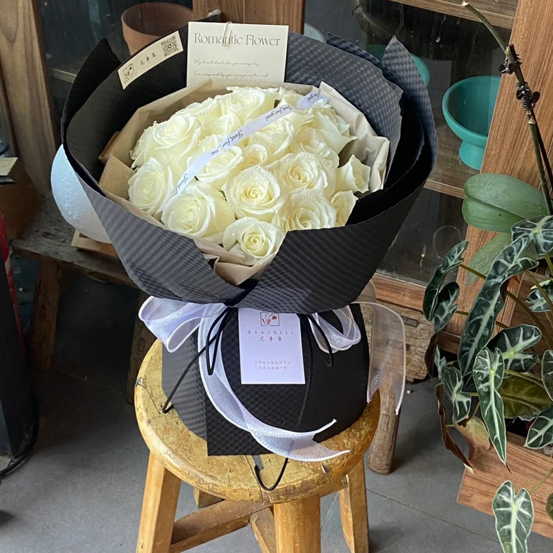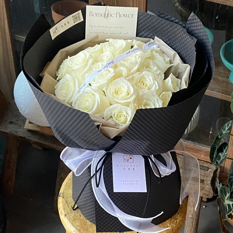 花材: 19朵白玫瑰,白色英文缎带装饰花面。