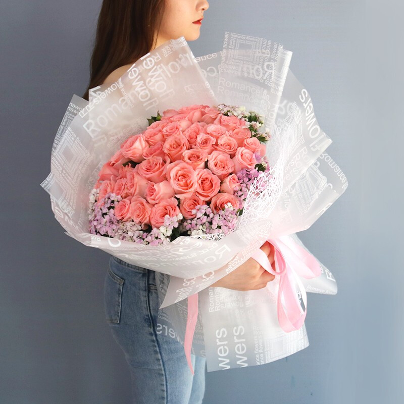 包装: 落水纸内衬,英文雾面纸多层包装,粉色丝带花结。