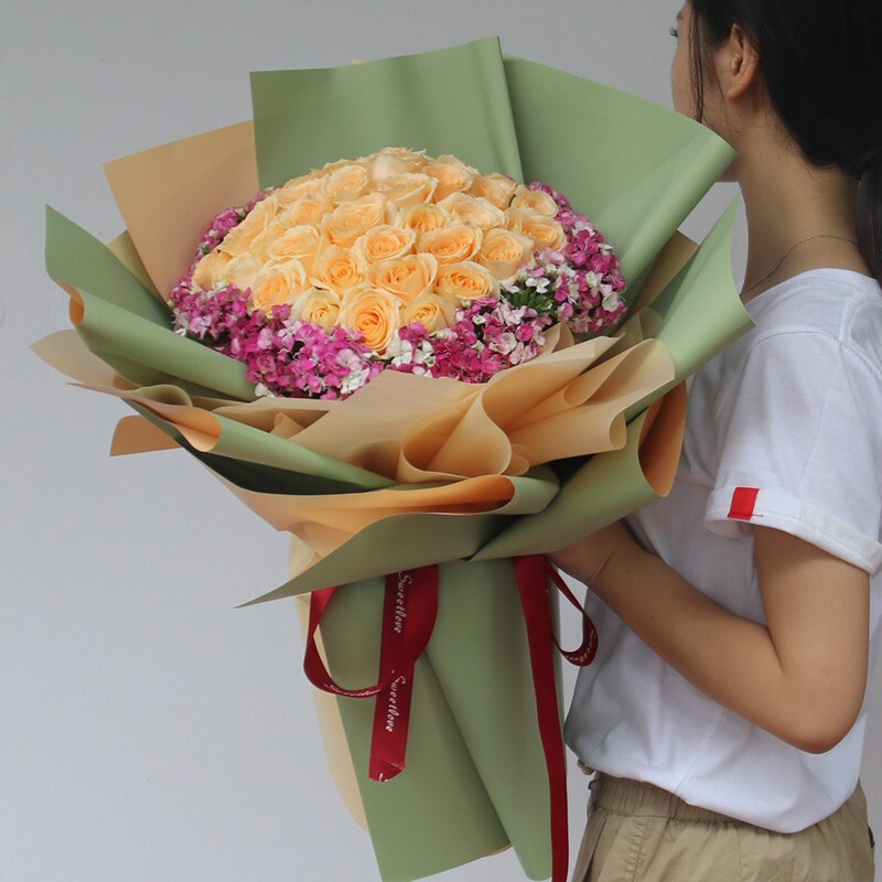 花材: 33朵香槟色玫瑰,外围搭配相思梅环绕。