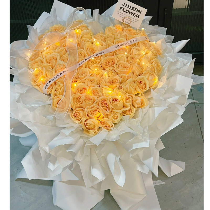 花材: 99支香槟玫瑰心形造型,1条灯串,1条缎带,1支蝴蝶结装花面。