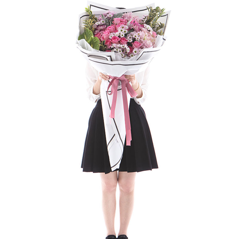 包装: 白色软纸+黑边白色硬纸韩式扇形包装,精美粉色丝带蝴蝶结束扎。