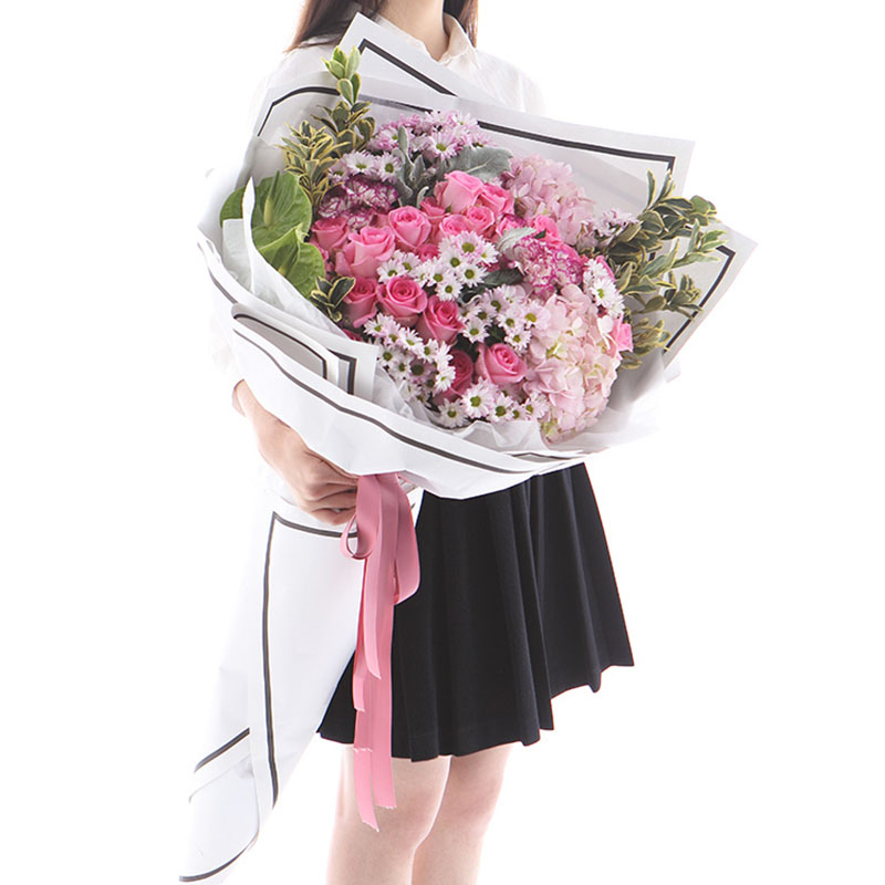 花材: 粉绣球2支、苏醒粉玫瑰19支、绿掌2支、紫边康乃馨6支、白粉色小雏菊15支,搭配适量金边黄楊、银叶菊装饰。(花束高度:1.2 - 1.3m 左右,人工测量有误差,具体以实物为准)
