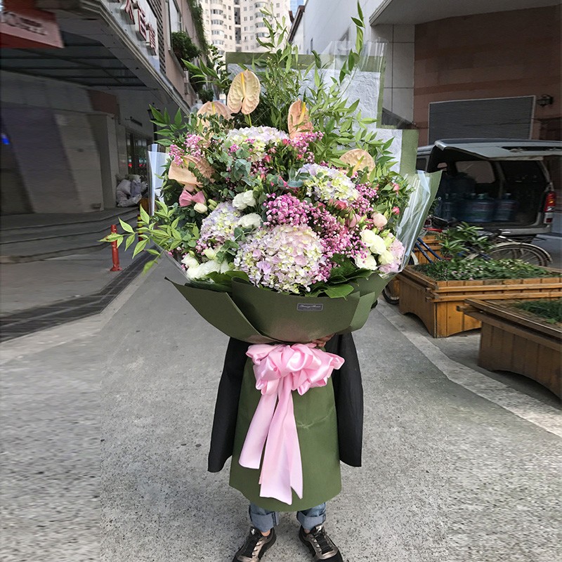 包装: 白色软质+白色透明包装纸+绿色硬纸韩式扇形包装,精美粉丝丝带蝴蝶结束扎。(花束高度1.6米左右,人工测量有误差,具体以实物为准)