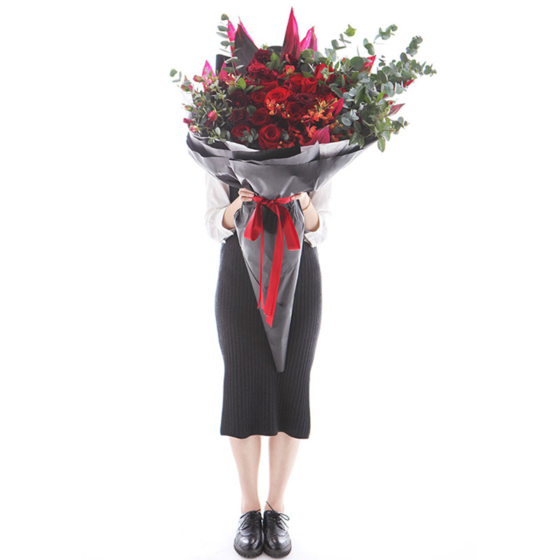 包 装:白色硬纸+黑色硬纸韩式扇形包装,精美红色丝带蝴蝶结束扎。(花束高度:1.2 - 1.3m 左右,人工测量有误差,具体以实物为准)