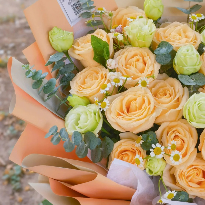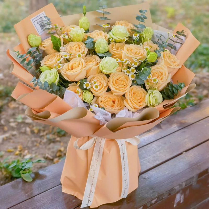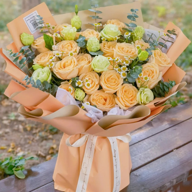 花材: 19朵精品香槟玫瑰,8支洋桔梗,搭配尤加利叶、洋甘菊点缀。