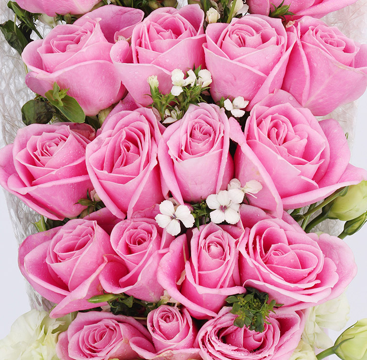 花材: 精选19朵玛利亚玫瑰,搭配相思梅、桔梗。