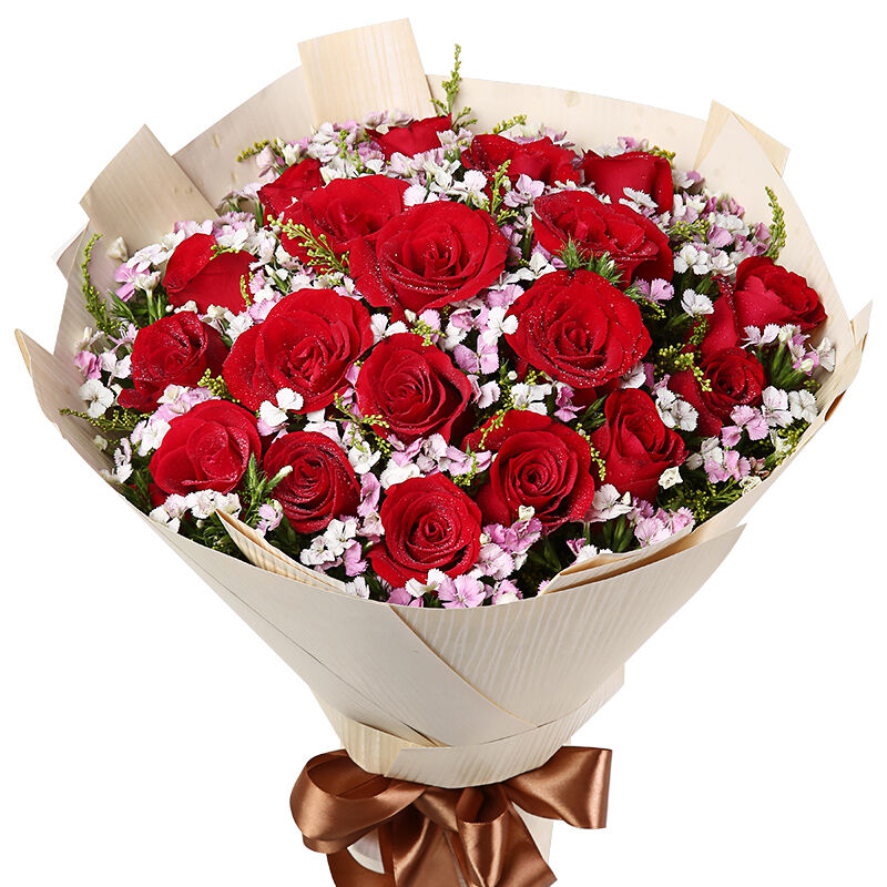 花材: 19支精品红玫瑰,搭配适量粉色石竹梅、黄莺间插