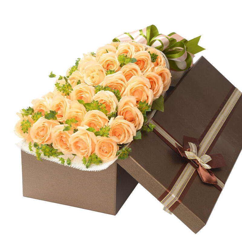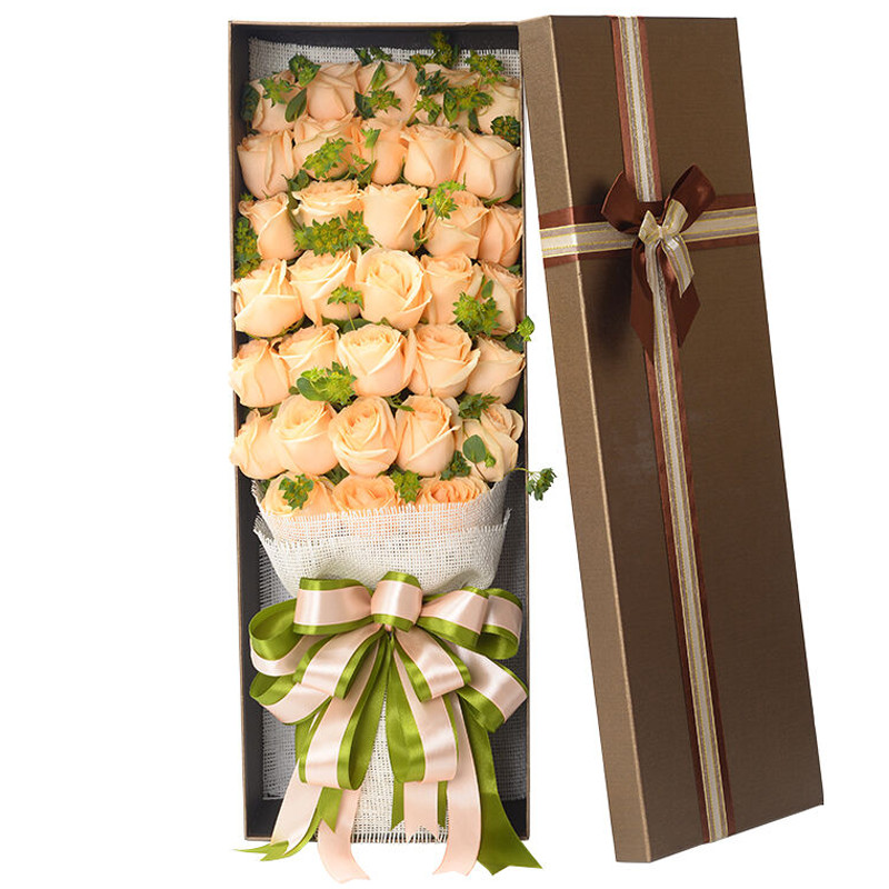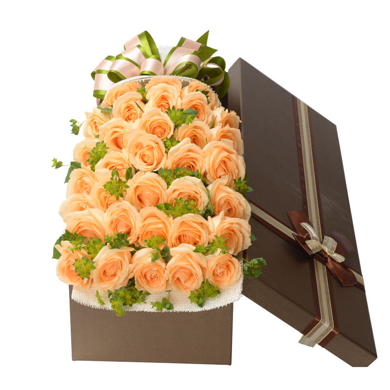 花 材:33支香槟玫瑰,搭配适量叶上黄金