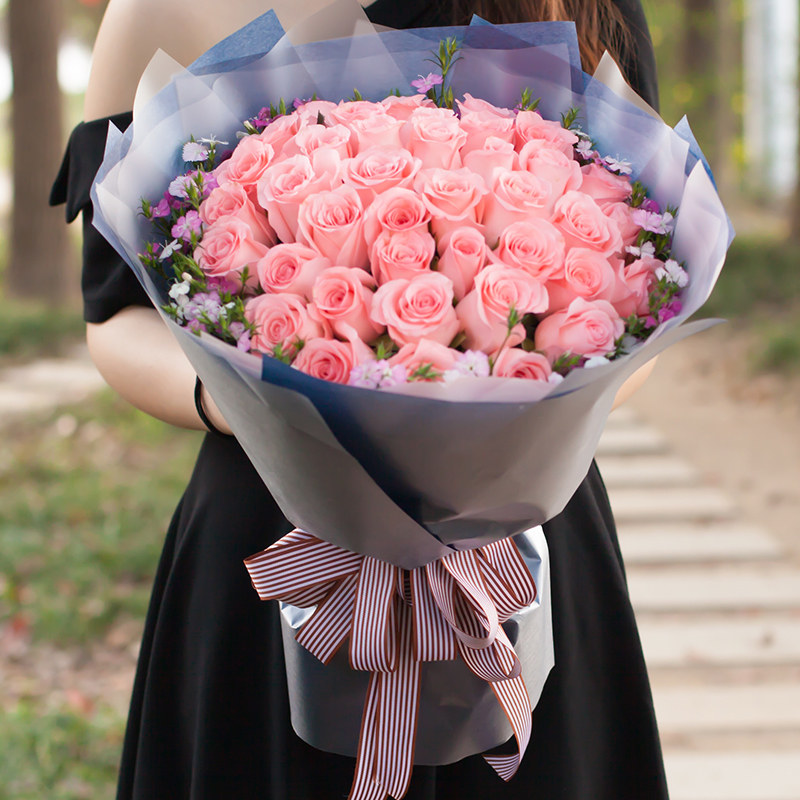 花 材:33支粉玫瑰,搭配适量相思梅装饰。
