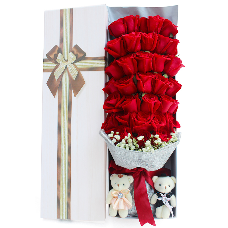 花材: 33支精品红玫瑰+2只可爱小熊,搭配适量白色满天星