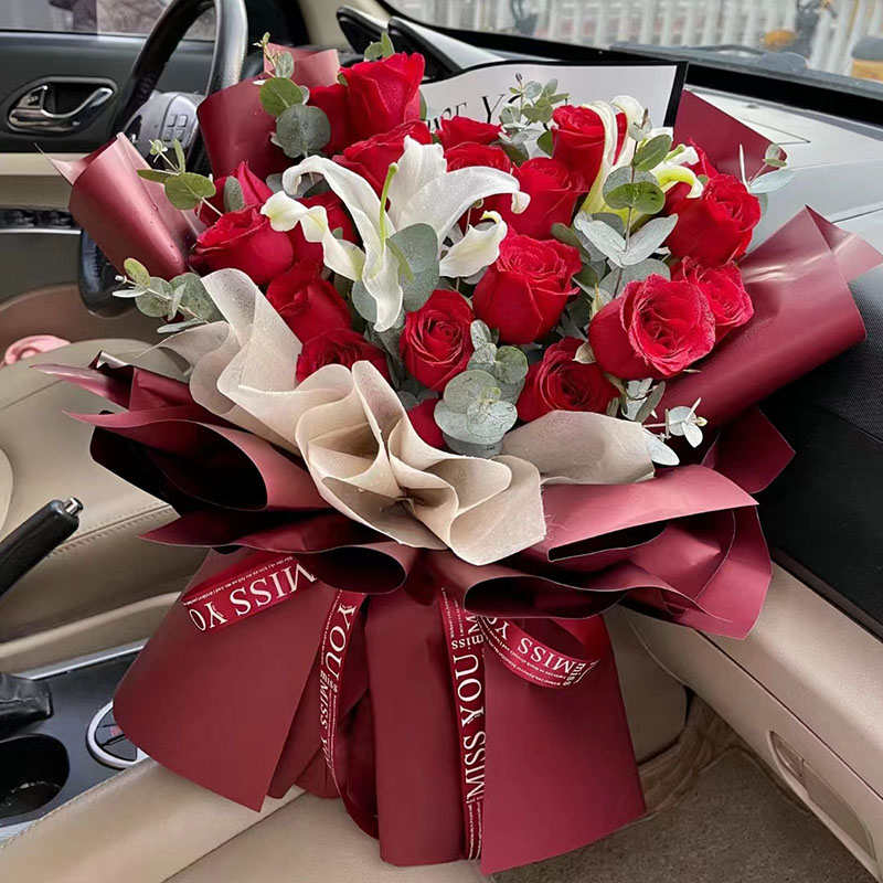 花材: 19朵红玫瑰,1支多头白色香水百合,搭配尤加利叶装饰。
