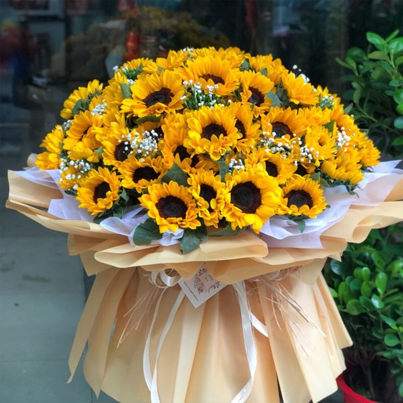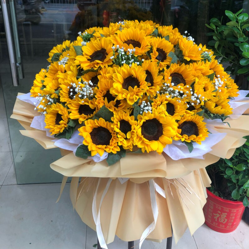 花材: 精选99支向日葵,搭配满天星、绿叶装饰。白色雪梨纸内衬,香槟色雾面纸多层外包,同色系缎带花结。
