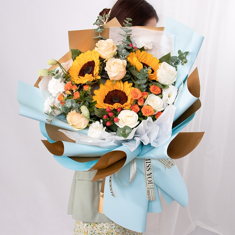 花 材:3朵向日葵,9朵(香槟玫瑰、白玫瑰)混搭,搭配3支多头橙色小玫瑰,洋桔梗,尤加利叶装饰。