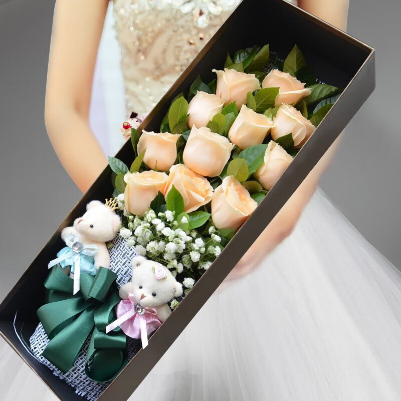花材: 11朵香槟玫瑰,2只可爱小公仔,栀子叶,满天星间插丰满。