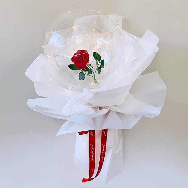 花 材: 1朵精品红玫瑰,可亮灯带一条,波波气球(玫瑰颜色可替换)