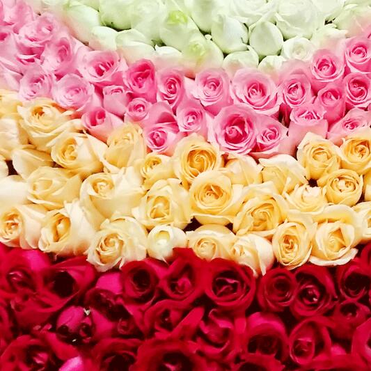 花材: 999朵玫瑰(蓝色、白色、粉色、香槟色、红色),一圈圈按颜色环绕,满天星最外围点缀。