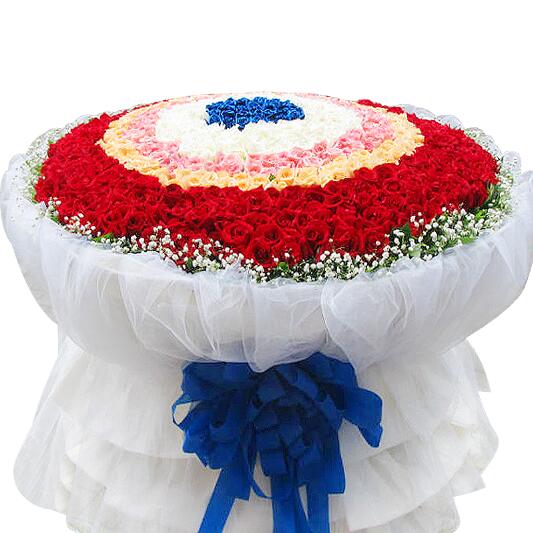 花 材:999朵玫瑰(蓝色、白色、粉色、香槟色、红色),一圈圈按颜色环绕,满天星最外围点缀。