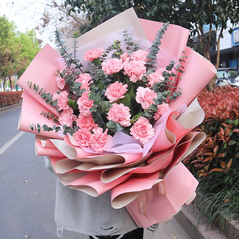 花 材:19朵粉色康乃馨,搭配尤加利叶。