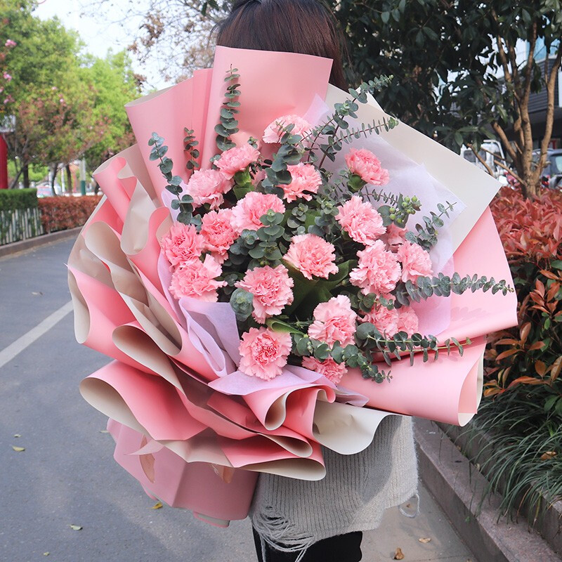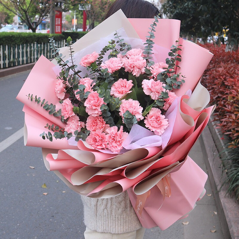 花材: 19朵粉色康乃馨,搭配尤加利叶。