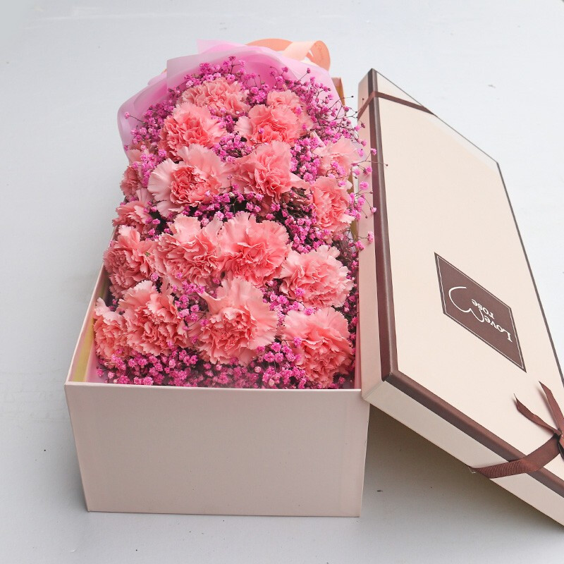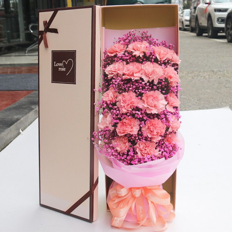 花材: 精选19朵粉色康乃馨,搭配粉色满天星装饰。