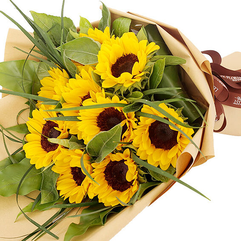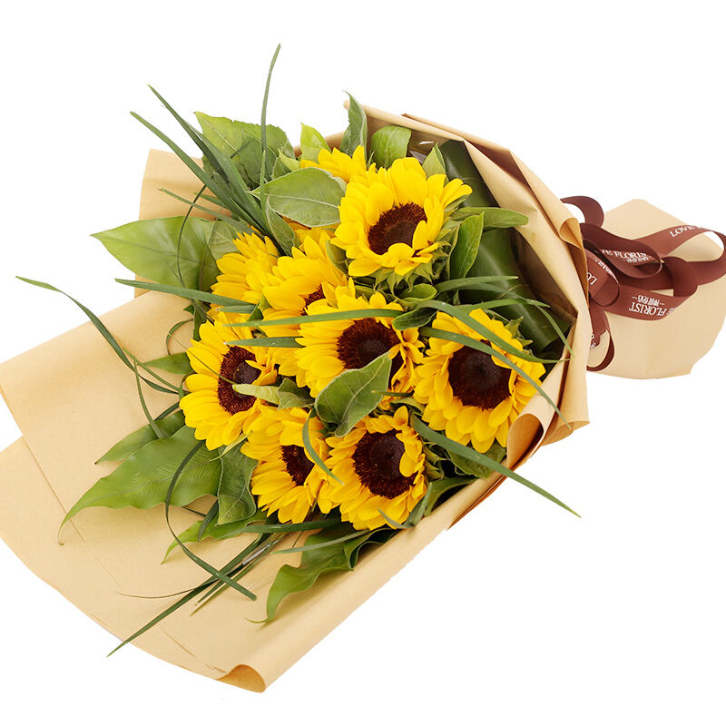 花材: 9支精品向日葵,搭配适量绿叶、丝带草。