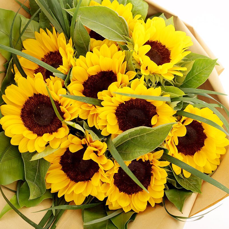 花 材:9支精品向日葵,搭配适量绿叶、丝带草。